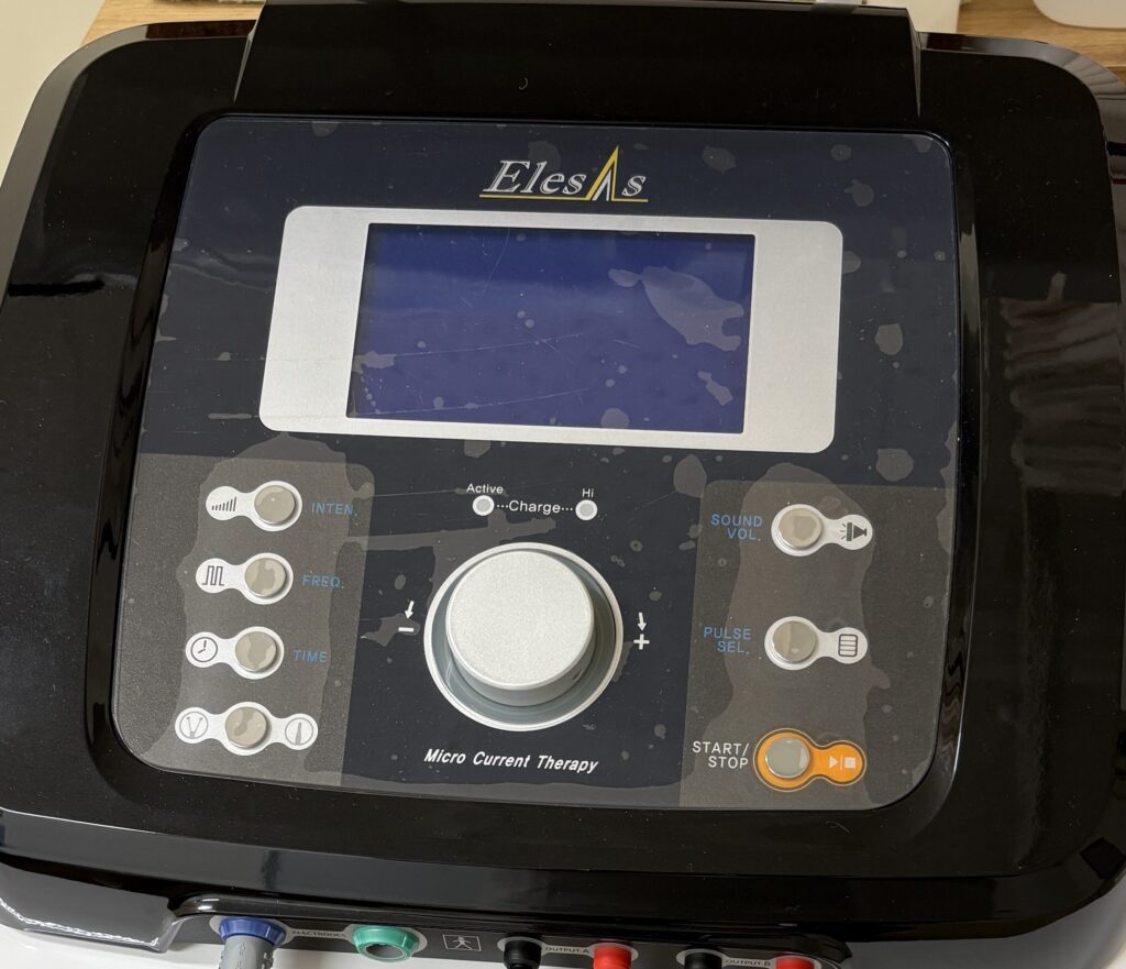 当院での施術のメイン機であります、微弱電流治療器エレサスですが