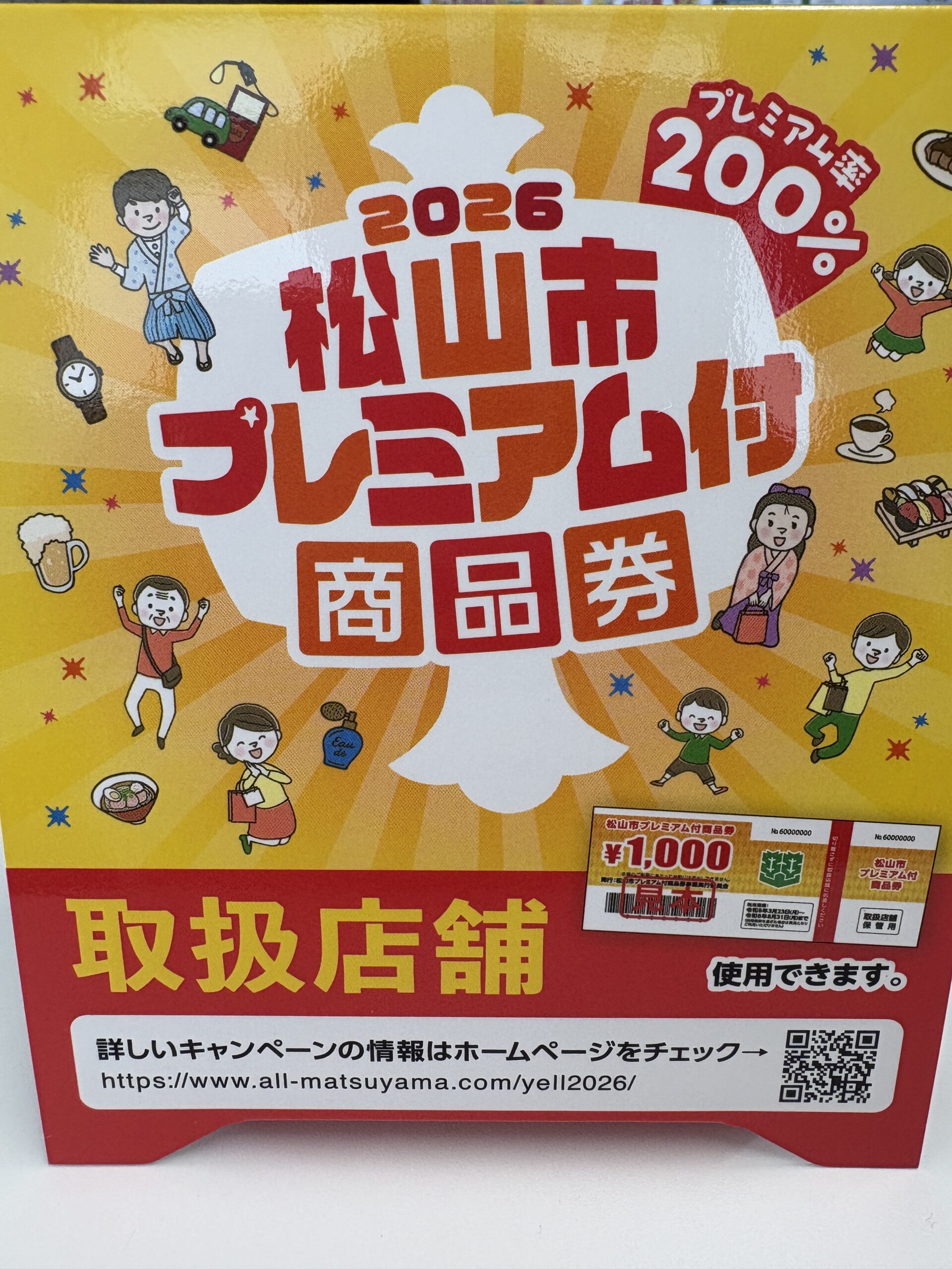 松山市プレミアム付き商品券取り扱います! 2026.04.09 いよいよ始まりました!プレミアム商品券、皆様もう購入はお済でしょうか?今回の商品券は200%分お得なので、ぜひ購入してみてください。当院でも取り扱いできますので、ぜひこの機会にお悩みをご相談ください!